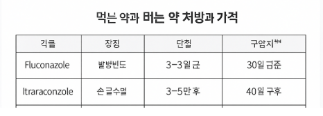 - 중증/광범위 병변: 테르비나핀 1차 선택약, 이트라코나졸은 칸디다·비전형균 경우, 플루코나졸은 간 부담 적은 환자에게 대체제로 활용.