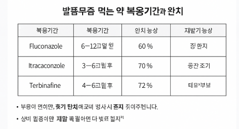 | 테르비나핀 | 250 mg 매일 | 손톱 6주, 발톱 12–16주 | 35–78% |