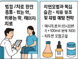 | 관리 목적 / 보조 | 외용제 + 생활습관 관리 | 재발률 낮춤 | 생활습관 철저히 지켜야 |